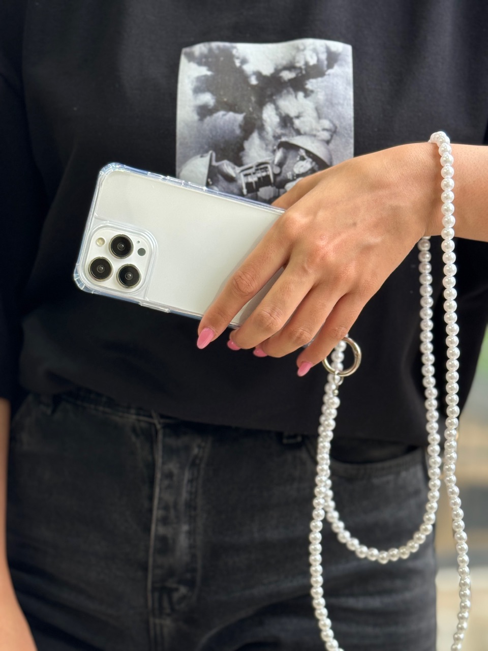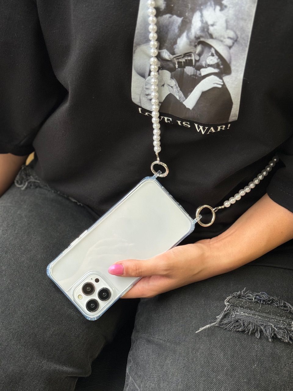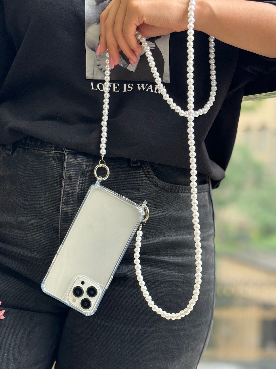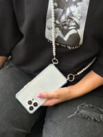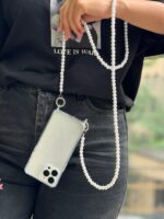 قاب شفاف دو قلاب با بند مرواریدی گردنی بلند ، قاب آیفون ، فروش عمده قاب و لوازم جانبی گوشی