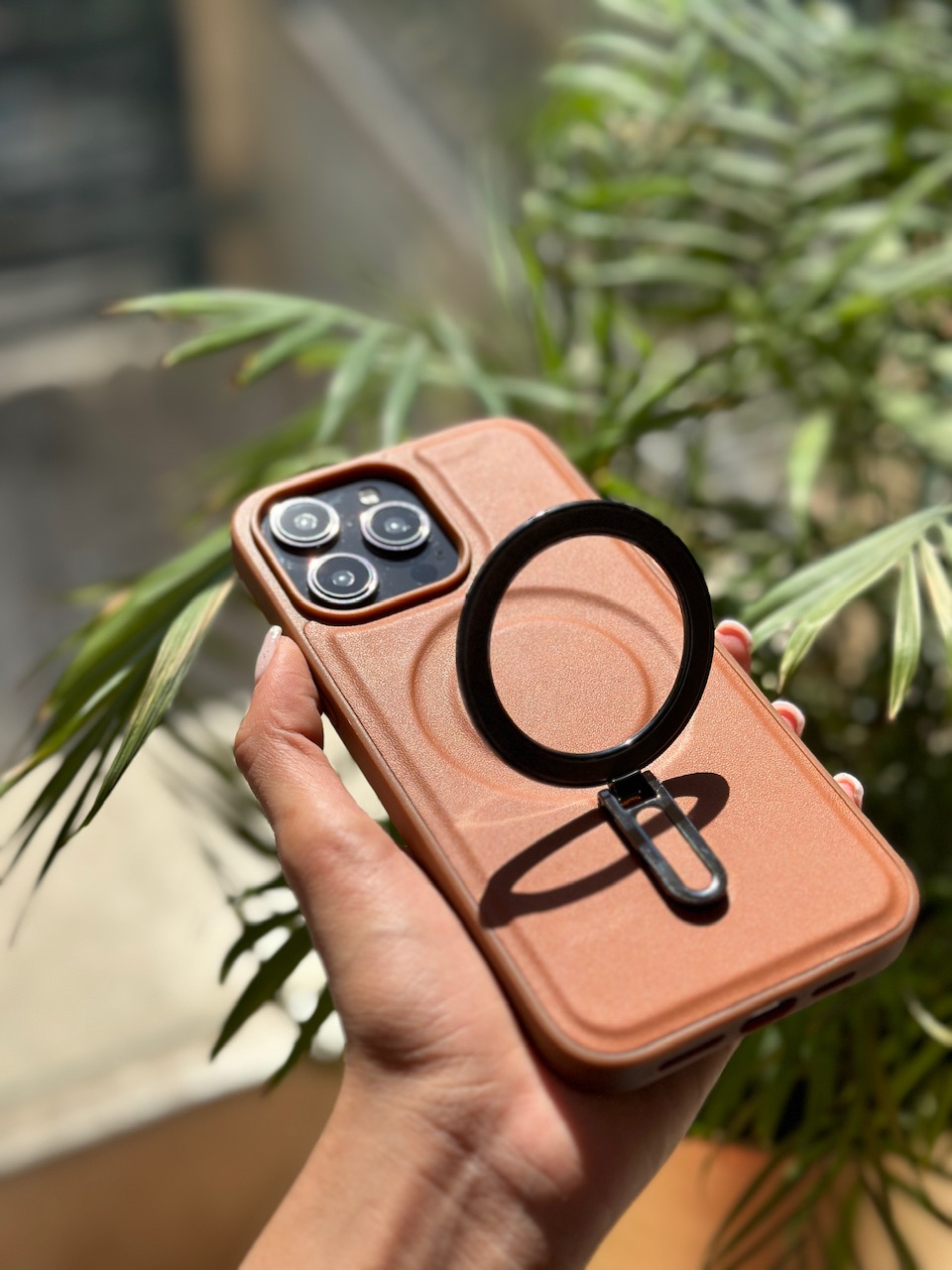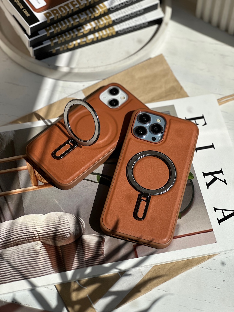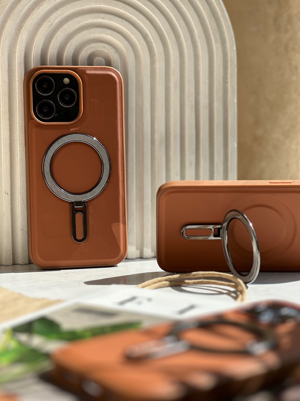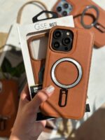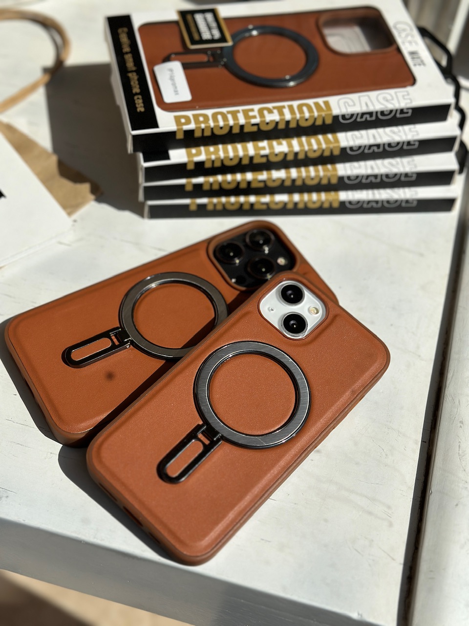 قاب چرمی / قهوه ای / آیفون / مگ سیف استند شو / استند فلزی / با پک