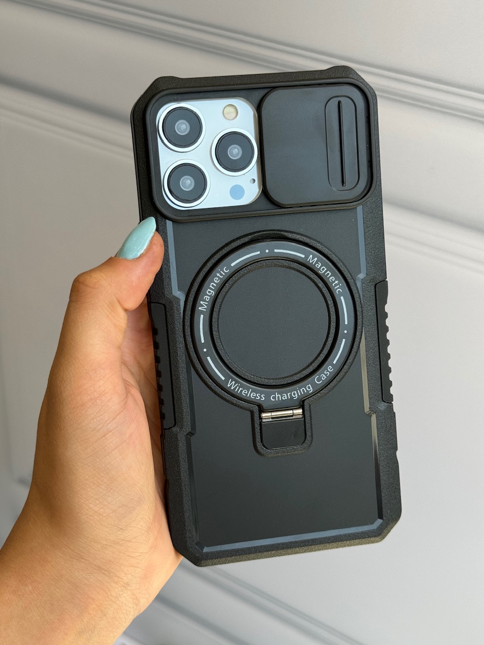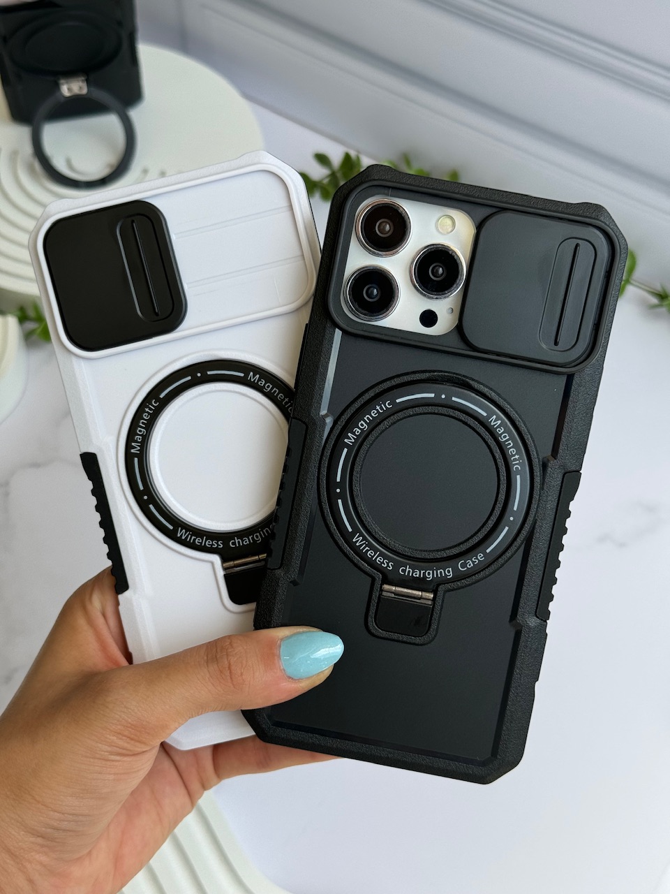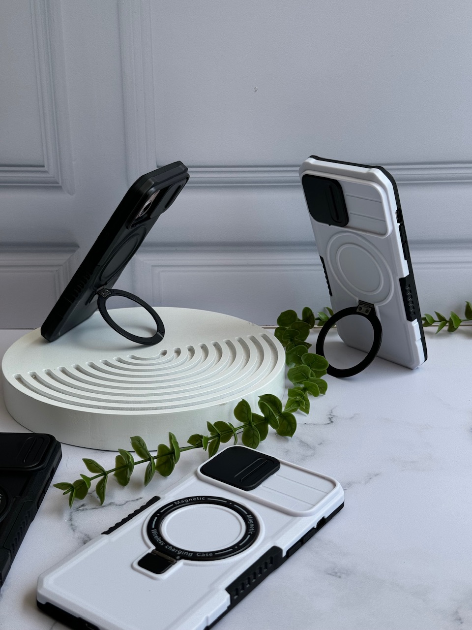 محافظ لنز کشویی / استند شو / مگ سیف فعال / آیفون / دو رنگ سفید و مشکی / داخل سیلیکون / قاب عمده آیفون / قاب گوشی عمده