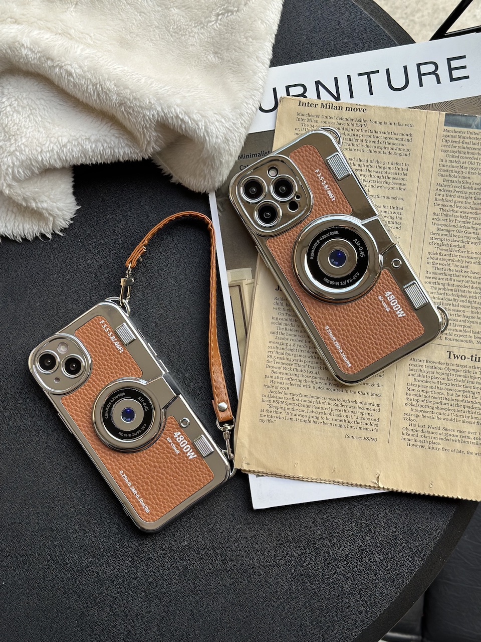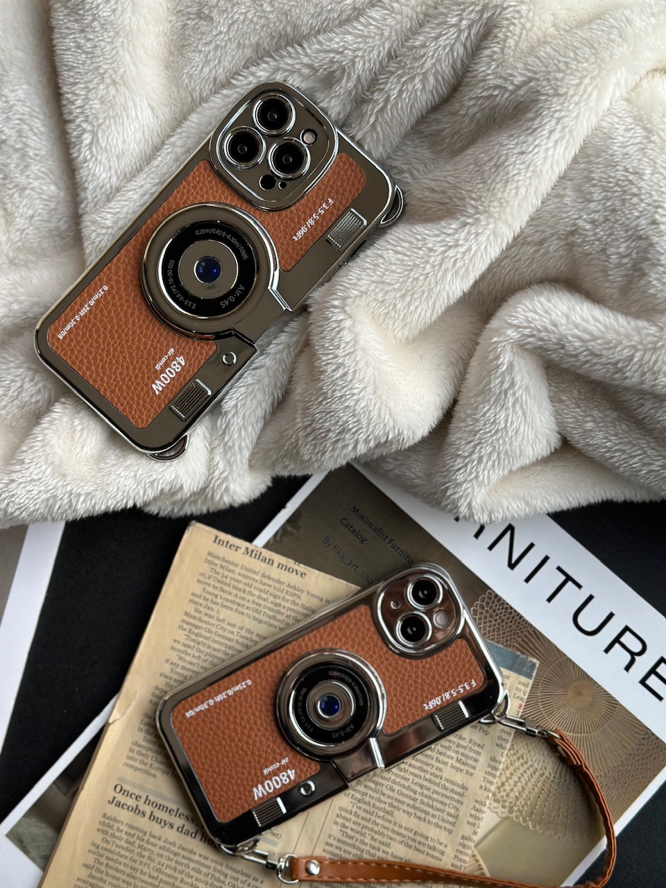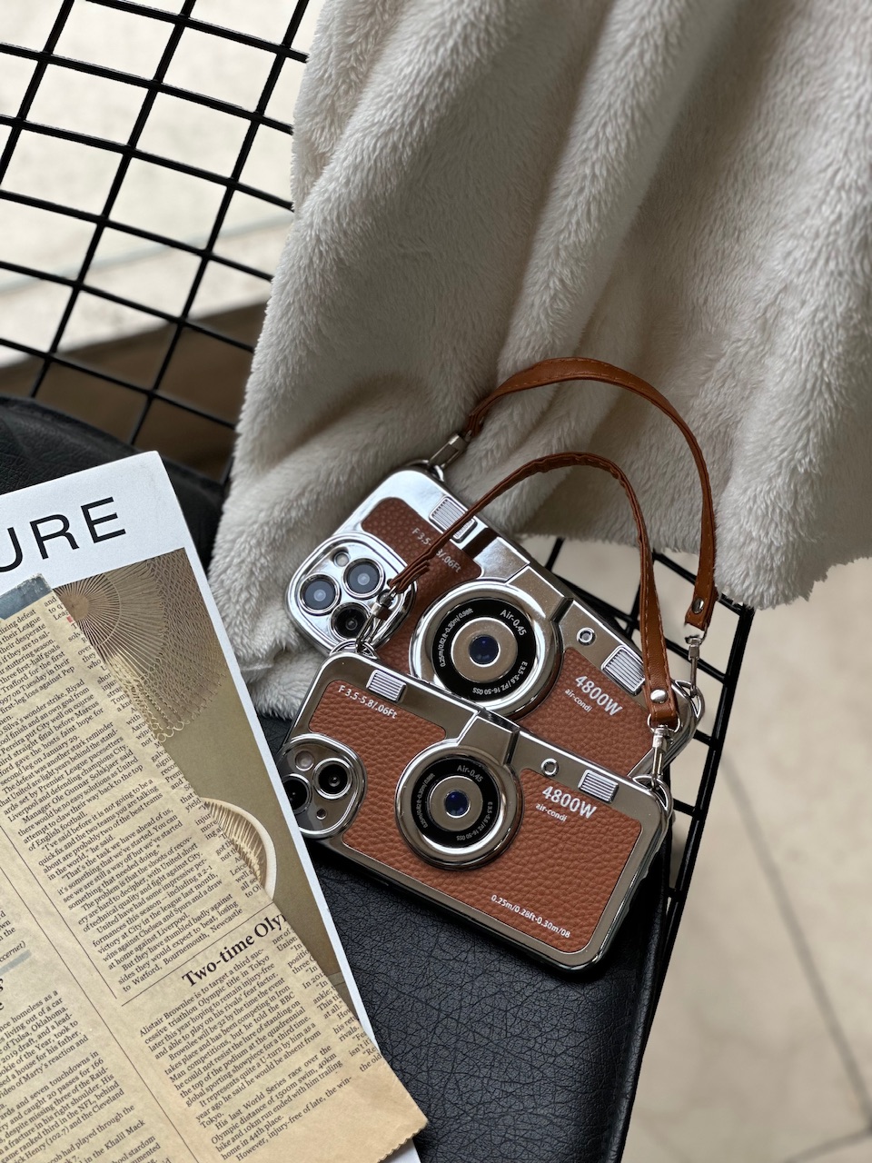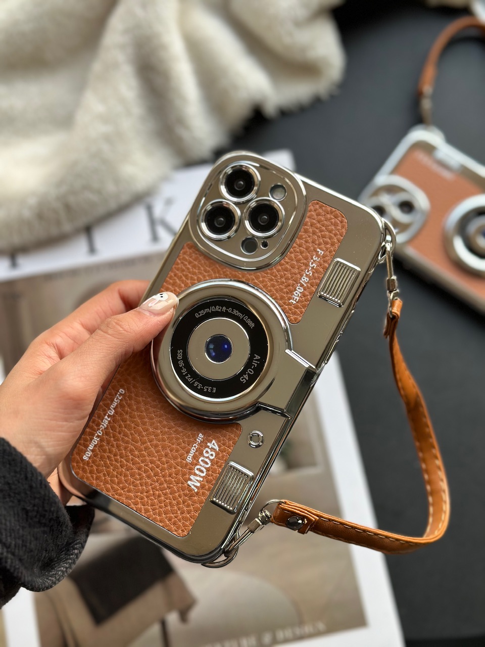 قاب دوربین قدیمی / آیفون / پشت چرمی / جنس کل قاب کروم / با بند چرمی کوتاه