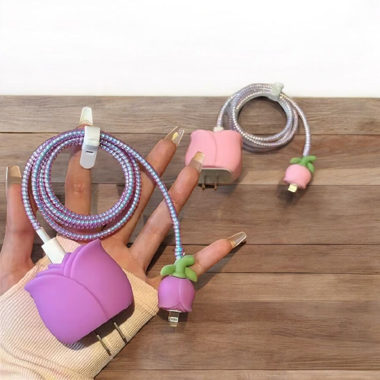 پک 4تایی محافظ شارژر و کابل طرح گل رز بنفش
